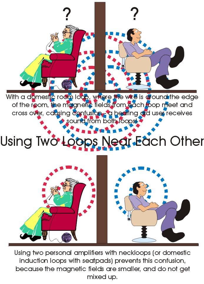 One other problem you can sometimes have with a loop, happens when you have two loops close together. The magnetic fields from each loop get mixed up, and you pick up sound from both loops. This can be very confusing. It can occasionally happen with flats, where two flats next to each other both have loops. The problem can be solved by using personal loop amplifiers, or using seatpads.